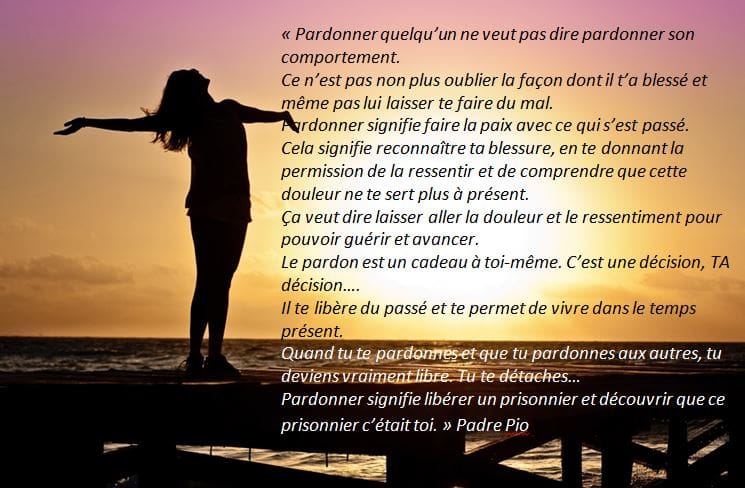Attention, un vrai pardon n’est pas un acte dicté par la morale ou par la religion. Pour être efficace, il doit provenir du plus profond de vous. Et c’est à vous de définir ce qui est pardonnable. Il est parfois nécessaire de se faire aider si pardonner vous paraît trop difficile comme cela peut être le cas d’un traumatisme subi.